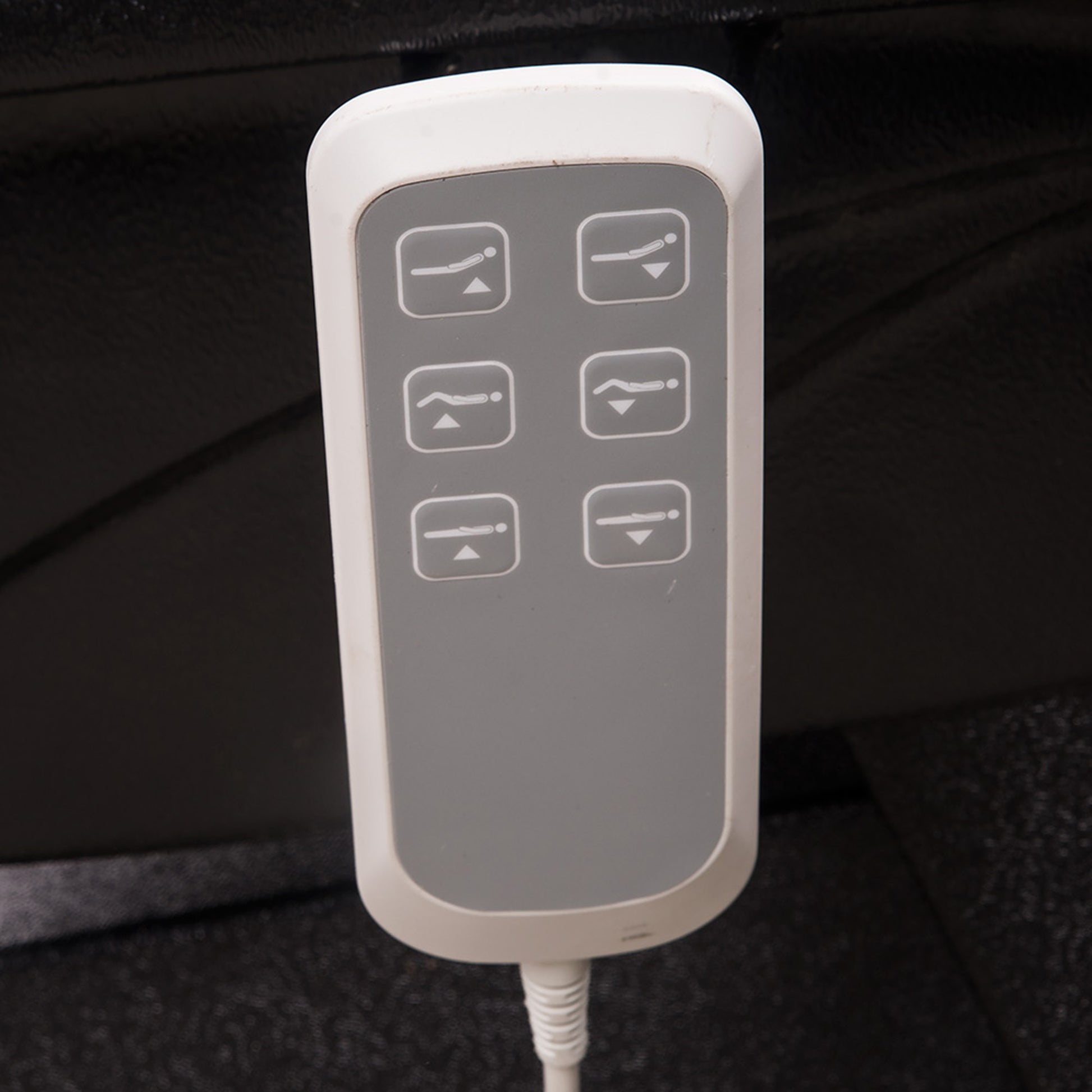 - Höhe, Neigung der Rückenlehne sowie negative Neigung des Sitzes sind über 3 kraftvollen Motoren per Handschalter verstellbar